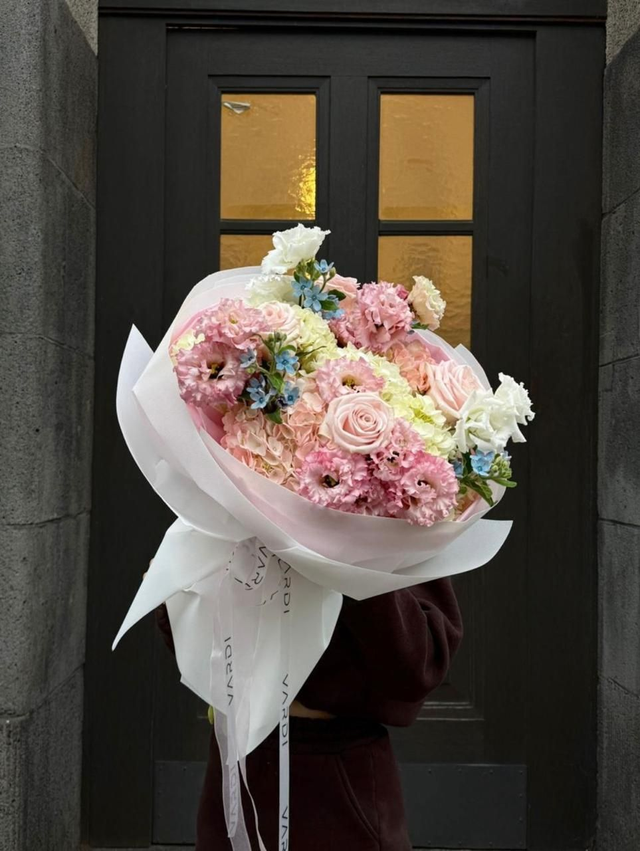 Das Bouquet „coral love“ vereint rosa und weiße Hortensien mit feinem blauem Oxypetalum, gefülltem Lisianthus in Hanoi Pink und Weiß sowie eleganten Pink O’Hara Rosen aus Ecuador. Die harmonisch gemischte Farbwelt wirkt lebendig und zugleich ausgewogen. Abgerundet wird das Bouquet durch eine matte weiße Verpackung mit rosafarbenem Tissue und einem weißen VARDI-Satinband – modern, weich und stilvoll arrangiert.