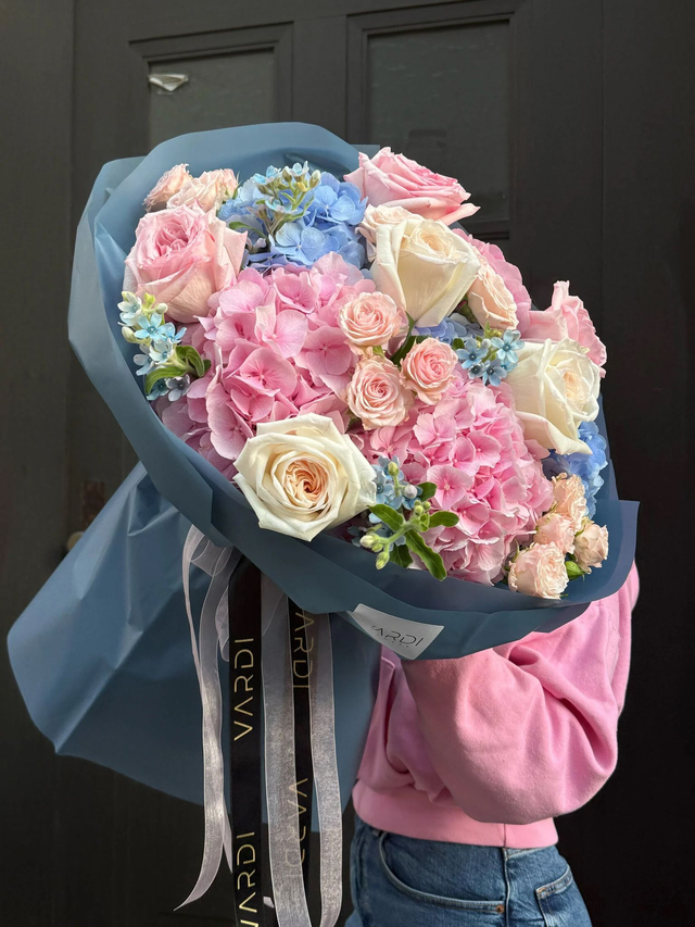 monaco dusk verbindet kühle Blautöne mit zartem Rosé zu einem eleganten, ausbalancierten Arrangement. Rosa und blaue Hortensien bilden die voluminöse Basis, ergänzt durch Ohara-Rosen in Weiß und Pink, feine verzweigte Aerobic-Rosen und dezentes Oxypetalum. Die mattblaue Verpackung mit schwarzem und roséfarbenem VARDI-Seidenband verleiht dem Bouquet eine moderne, urbane Eleganz – stilvoll, ruhig und außergewöhnlich.