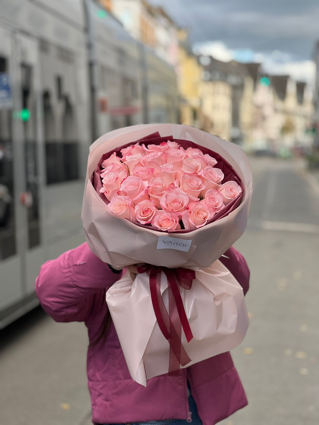 Das Bouquet „rosé devotion“ vereint 25 Premium-Rosen aus Ecuador der Sorten Rhoslyn / Christa in einem harmonischen Rosé-Spektrum. Die fein abgestimmten Farbnuancen wirken weich und elegant, während die präzise, runde Bindung dem Bouquet eine ruhige, ausgewogene Präsenz verleiht.Edles bordeauxfarbenes Tissui setzt einen stilvollen Kontrast zur creme-rosé mattierten Verpackung und unterstreicht den modernen, luxuriösen Charakter. Abgerundet wird das Arrangement durch ein bordeauxfarbenes Seidenband, das dem Bouquet eine klare, hochwertige Signatur verleiht.Ein Rosé-Rosenbouquet mit zurückhaltender Eleganz – zeitlos, feminin und bewusst reduziert.